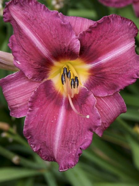 Hémérocalle au fleurs de 12 cm diamètre, rose violine, strié blanc, à œil pourpre. Gorge jaune.