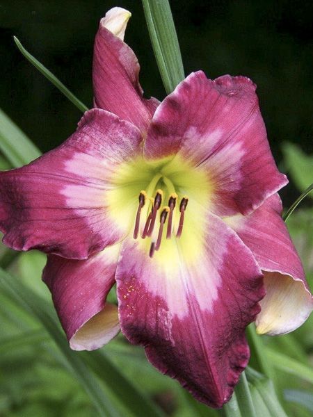 Hémérocalle aux fleurs de 12 cm de diamètre, violines, à large œil rose pâle et gorge vert chartreuse.