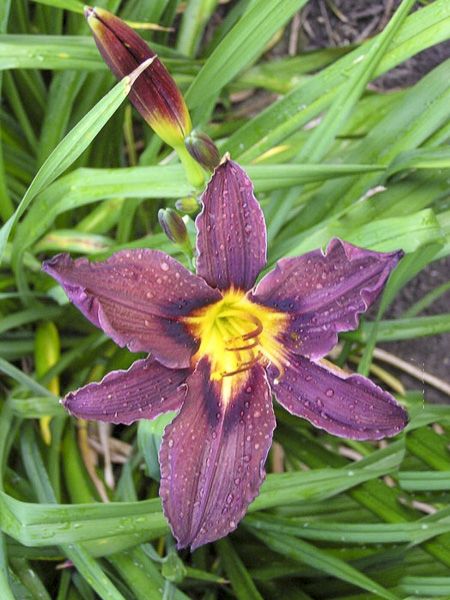Hémérocalle aux fleurs de 12 cm de diamètre, brun violacé, à œil violet et gorge jaune.
