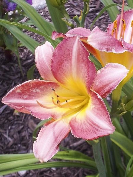Hémérocalle aux fleurs de 14 cm de diamètre, rose profond, à stries centrales crème et gorge jaune.