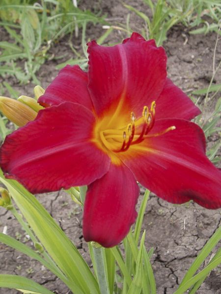 Hémérocalle aux fleurs de 12 cm de diamètre, rouge cerise à gorge jaune d'or.