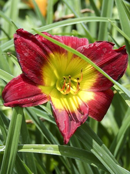 Hémérocalle aux fleurs de 11 cm de diamètre, rouge carminé intense, à large gorge jaune chartreuse. Bien remontante.