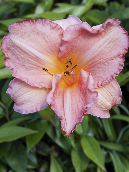 Hémérocalle aux fleurs de 12 cm de diamètre, à pétales ondulés, en dégradé de rose et gorge orange.