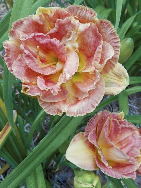 Hémérocalle aux fleurs bien doubles de 10 cm de diamètre, rose et jaune pâle. Remontante.