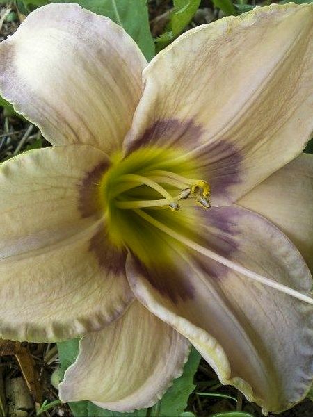 Hémérocalle aux fleurs de 16 cm de diamètre, rose mauve très pâle à œil violet pâle et gorge chartreuse. Remontante