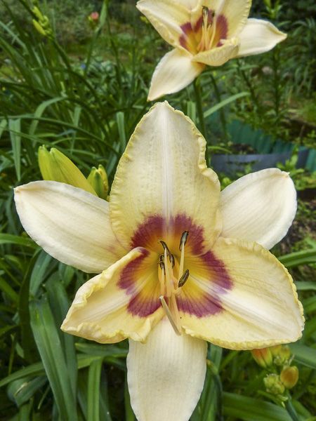 Hémérocalle aux fleurs de 15 cm de diamètre, jaune crème, à œil lie de vin et gorge chartreuse.