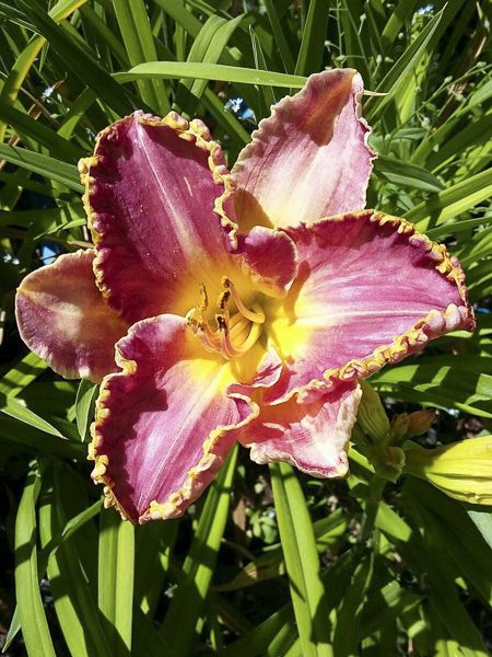 Hémérocalle aux fleurs de 15 cm de diamètre, aux pétales rose pourpré frangés de jaune d'or et gorge jaune d'or à crème.