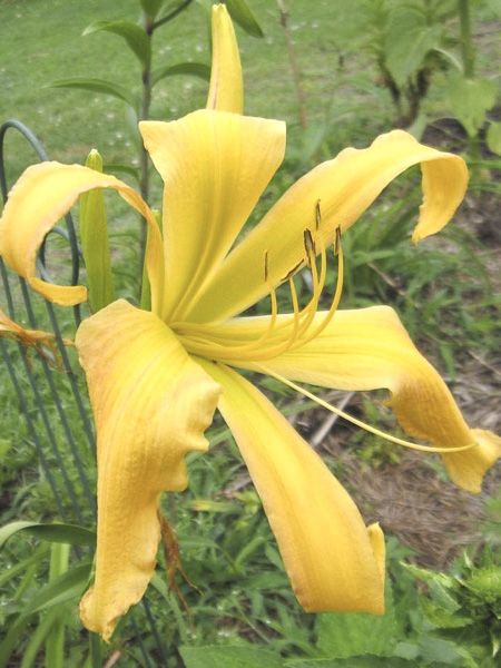 Hémérocalle de type araignée, aux très grandes fleurs de 28 cm de diamètre, aux pétales crispés, jaune d'or à gorge chartreuse.
