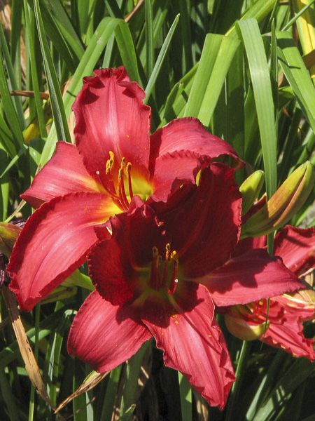 Vivaces d'été par excellence, les hémérocalles ou lis d'un jour sont appelées ainsi car leurs fleurs ressemblent à celles du lis et ne durent qu'un jour, mais elles se renouvellent pendant un bon mois en été. Certaines sont remontantes, ce qui permet d'obtenir une floraison de juillet jusqu'aux gelées. La palette de coloris de leurs fleurs est immense, en général dans les tons chauds variant du rouge intense au rose et au violet très sombre. D'autres sont jaunes ou blanches. Leur taille varie de 30 cm à plus d'un mètre de hauteur. Enfin, leur feuillage n'est pas inintéressant. Elles sont solides et de culture facile à partir du moment où vous les installez au soleil, dans pratiquement tout type de terrain. Vous pouvez les diviser au bout de quelques années, elles n'en fleuriront que mieux. Les hybrides d'hémérocalle ne sont pas connu pour déclencher d'allergies. A privilégier pour la conception d'un jardin sans allergie.
