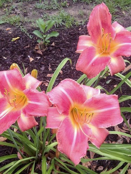 Hémérocalle aux fleurs de 17 cm de diamètre, rose fuchsia à gorge jaune d'or et bande médiane médiane blanche. Remontante.