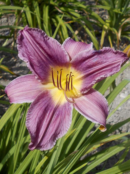 Hémérocalle aux fleurs de 14 cm de diamètre, prune clair à gorge jaune d'or. Très florifère.