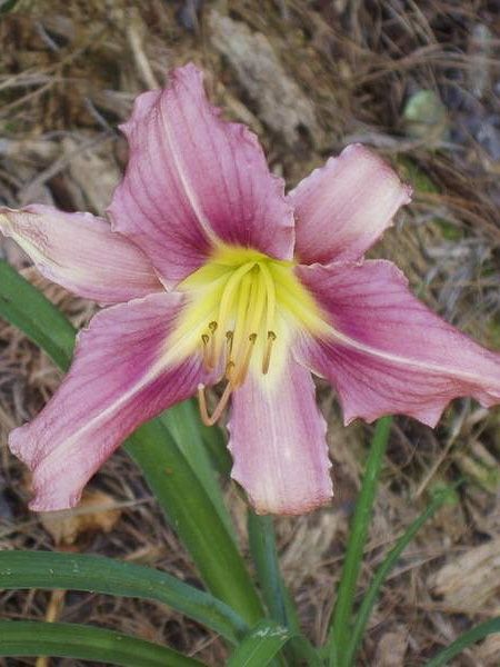 Fleurs de 14 cm de diamètre, rose pourpré à gorge chartreuse. Diploïde.