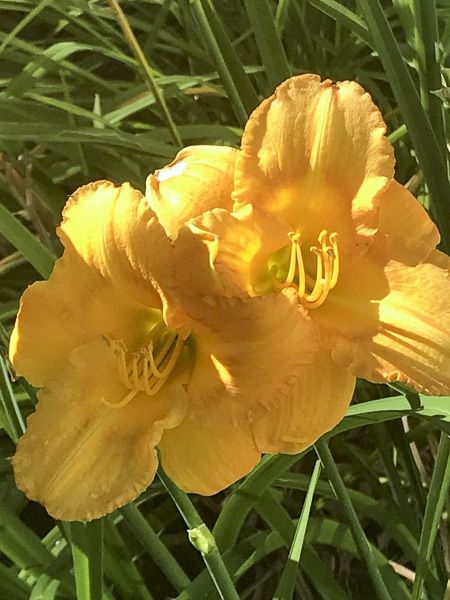 Hémérocalle aux fleurs de 20 cm de diamètre, aux pétales frangés, jaune d'or profond.