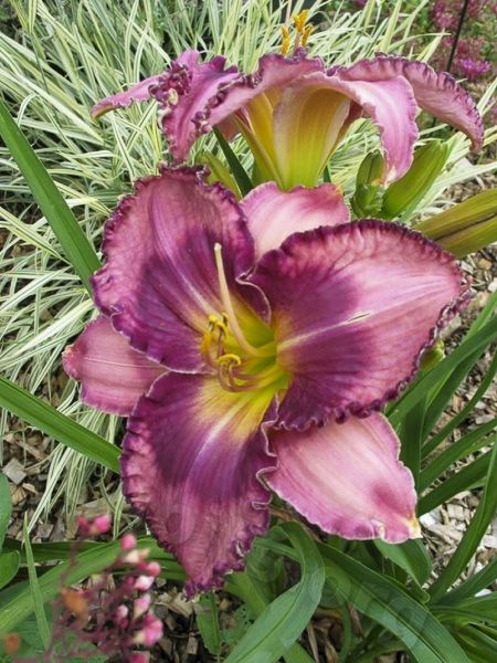 Hémérocalle aux fleurs de 16 cm de diamètre, aux pétales frangés rose lavande à large œil pourpre violacé et gorge jaune d'or à chartreuse.