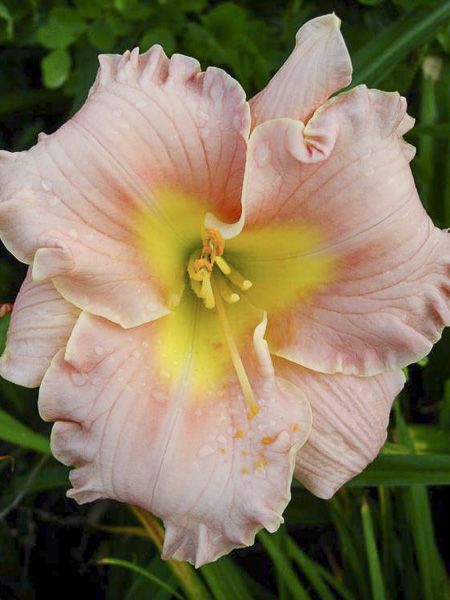 Hémérocalle aux fleurs de 12 cm de diamètre, aux pétales frangés rose tendre à œil peu marqué pourpré et gorge chartreuse.