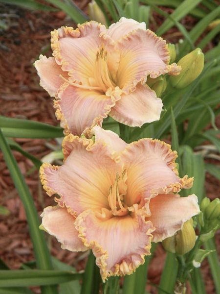 Fleurs de 15 cm de diamètre, saumon veiné de rose pourpré, à gorge verte. Tétraploïde.