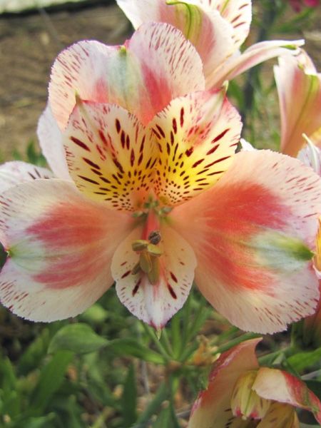 Fleurs dans les tons rose pâle à orange saumoné et jaune, tigrées de brun. Rustique jusqu'à -15°C. Bien florifère sur une longue période.