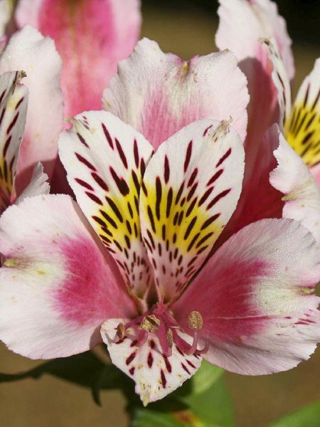 Fleurs blanches à large gorge rose pourpré, macule jaune, tigrées de brun. Rustique jusqu'à -15°C. Bien florifère sur une longue période.