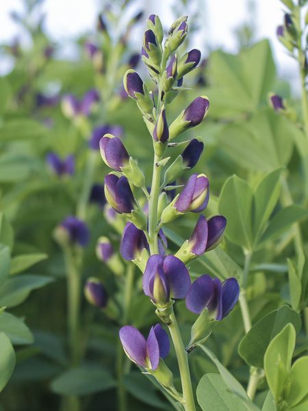 Le Baptisia australis ne manque pas de charme. Les fleurs d'un beau bleu indigo sont disposées en épis lâches le long de tiges souples. Les feuilles à trois folioles, vert bleuté disposées le long de tiges érigées forment de belles touffes très décoratives. Les fleurs sont suivies de petites graines contenues dans des gousses presque noires. Cette plante casanière vit très longtemps (plusieurs dizaines d'années). Comme elle a une racine pivotante de belle taille, une fois qu'elle est bien installée, il est déconseillé de la changer de place. Cette belle vivace demande de la patience. De croissance lente, il faut environ 5 ans pour qu'elle atteigne sa taille adulte et 3 ans pour que les premières fleurs apparaissent. Il est donc important de bien réfléchir à l'emplacement où elle sera installée. Facile à vivre, rustique, le Baptisia s'accommode de tous types de sols, même pauvres et légèrement calcaires, à condition qu'ils soient bien drainés. Il préfère les sols frais mais tolère les sols secs. La floraison sera alors moins abondante. Son allure champêtre en fait une plante idéale pour la réalisation d'un jardin sauvage ou naturel. Les fleurs tiennent bien en vase alors pensez à elles pour réaliser de grands bouquets champêtres. Le Baptisia demande peu d'entretien . Il faut juste rabattre la touffe en fin d'automne lorsque le feuillage a séché.