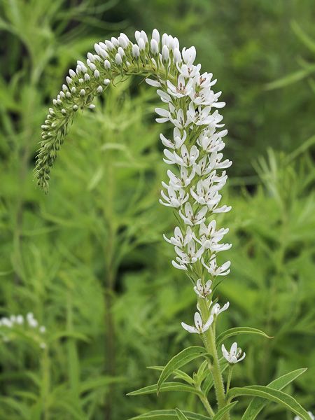 Plante herbacée, vivace, érigée. Tiges légèrement duveteuses. Feuilles de 5-8 cm de long, alternes, rarement opposées, linéaires, oblongues, lancéolées, poilues, vert moyen, glauques dessous. Grappes de 20-30 cm de long, pendantes, puis érigées, compactes, terminales, composées de fleurs blanches, en étoile, de 7-10 mm de diamètre.