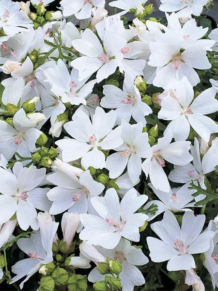 Variété naine et compacte de mauve musquée. En début d'été, succession de bouquets de fleurs blanches en forme de coupe échancrée. Feuilles étroites, incisées, lobées, légèrement odorantes.