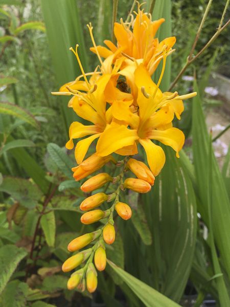 Une sélection vigoureuse et bien rustique de crocosmia aux fleurs jaune d'or, avec une pointe d'orange.