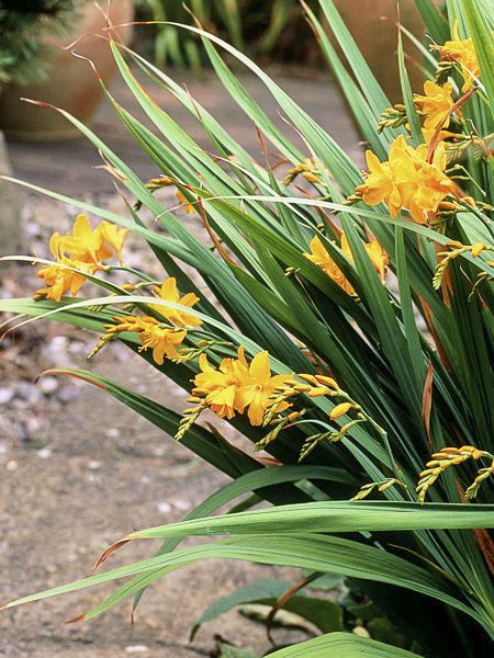 Mi-bulbe, mi-souche, ces plantes sont les plantes de lété. Faciles à cultiver, vigoureuses, peu exigeantes, elles se plantent au soleil en sol fertile. A la fin de l'été, les fleurs apparaissent sur des tiges dressées ou horizontales au mlieu du feuillage rubanné en gerbe assez dense. Les fleurs sont composées de 3 pétales internes et 3 pétales externes. Leurs coloris éclatants, jaune, orangé ou rouge égayent bien les jardins. Les fleurs des cultivars sont souvent ponctuées de brun, de rouge foncé ou de violet. Les Crocosmia n'aiment pas du tout la sécheresse estivale qui diminue leur floraison et les rendent plus sensibles aux maladies. Ils sont splendides en association avec des annuelles ou des arbustes.