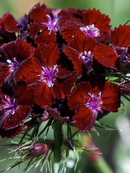 Œillet du poète compact aux bouquets de fleurs simples, rouge sombre, à anthères mauve.