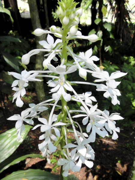 Orchidée terrestre non rustique aux hampes de fleurs blanc nacré, perchées haut au bout d'une fine tige. Belle touffe de feuillage vert luisant.
