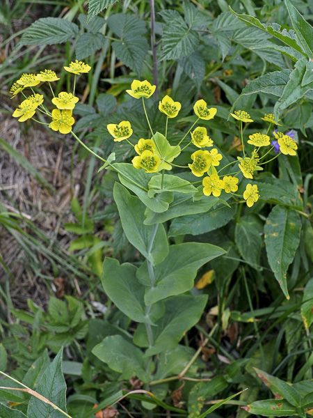 Annuelle ou vivace de courte durée. Feuilles glauques. Ombelles de 4-8 bractées vert-jaunâtre entourant de minuscules fleurs jaune-vert.
