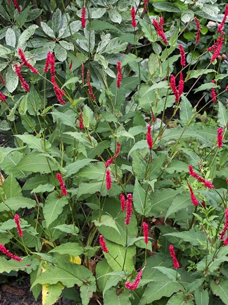 Vivace en touffes solides, buissonnantes. Feuilles ovales à lancéolées, 20 cm de long, cordiformes, pointues, vert foncé. Fleurs rose-rouge ou blanches de 5 mm, en épis de 15 cm de long.