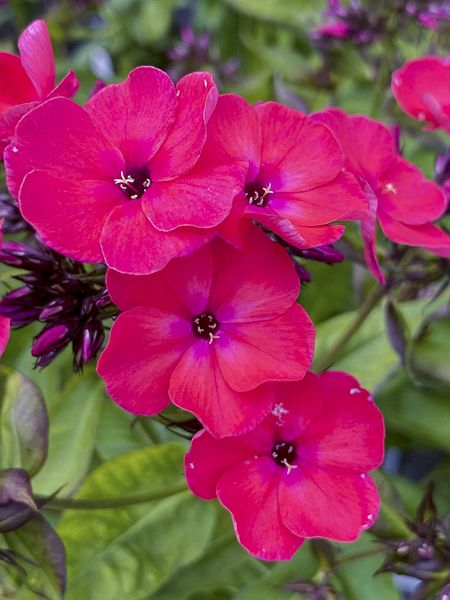 La floraison estivale des Phlox paniculata est spectaculaire dans les massifs de vivaces. La palette de couleurs de leurs fleurs varie dans tous les tons de rose, rouge, lilas, mauve et blanc. Suivant le choix des variétés, il est possible d'avoir des phlox paniculés en fleurs du début de l'été jusqu'au milieu de l'automne. Ce sont des bonnes fleurs à couper. Souvent parfumés, elles font le bonheur des insectes butineurs. Il est parfois nécessaire de les tuteurer en situation venteuse. Leur tige raide peut casser. Les phlox paniculés préfèrent les expositions ensoleillées. Ils acceptent la mi-ombre mais leur floraison sera moins luxuriante. Ils apprécient les expositions chaudes toutefois le sol doit rester frais. En situation très chaude, il ne faut pas hésiter à les arroser. Un paillis sera le bienvenu pour limiter l'évapo-transpiration. Il est conseillé de couper les fleurs fanées pour favoriser la production de nouvelles fleurs. Leur seul problème est l'oïdium qui peut s'installer dans certaines situations. Il est préférable de traiter préventivement pour éviter cet inconvénient. Les fleurs des phlox paniculés sont comestibles. Toutefois, il ne faut les consommer que si elles ont été cultivées naturellement (sans utilisation de produits phytosanitaires). Elles s'utilisent dans les crudités, les salades de fruits ou confites. par exemple. Phlox paniculata n'est pas connu pour déclencher d'allergies. A privilégier pour la conception d'un jardin sans allergie.
