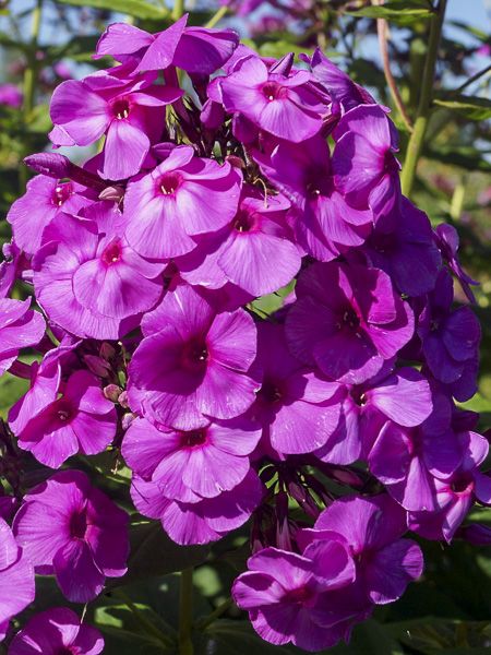 La floraison estivale des Phlox paniculata est spectaculaire dans les massifs de vivaces. La palette de couleurs de leurs fleurs varie dans tous les tons de rose, rouge, lilas, mauve et blanc. Suivant le choix des variétés, il est possible d'avoir des phlox paniculés en fleurs du début de l'été jusqu'au milieu de l'automne. Ce sont des bonnes fleurs à couper. Souvent parfumés, elles font le bonheur des insectes butineurs. Il est parfois nécessaire de les tuteurer en situation venteuse. Leur tige raide peut casser. Les phlox paniculés préfèrent les expositions ensoleillées. Ils acceptent la mi-ombre mais leur floraison sera moins luxuriante. Ils apprécient les expositions chaudes toutefois le sol doit rester frais. En situation très chaude, il ne faut pas hésiter à les arroser. Un paillis sera le bienvenu pour limiter l'évapo-transpiration. Il est conseillé de couper les fleurs fanées pour favoriser la production de nouvelles fleurs. Leur seul problème est l'oïdium qui peut s'installer dans certaines situations. Il est préférable de traiter préventivement pour éviter cet inconvénient. Les fleurs des phlox paniculés sont comestibles. Toutefois, il ne faut les consommer que si elles ont été cultivées naturellement (sans utilisation de produits phytosanitaires). Elles s'utilisent dans les crudités, les salades de fruits ou confites. par exemple. Phlox paniculata n'est pas connu pour déclencher d'allergies. A privilégier pour la conception d'un jardin sans allergie.