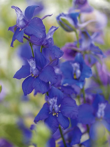 Les pieds d'alouette hauts et vivaces sont imposants et produisent de superbes hampes de fleurs, tenant bien en vase, dans les bleus pur, violets, roses ou blancs. Malheureusement, ce ne sont pas les plus faciles à cultiver et à conserver. Il faut les planter dans une terre riche, fraîche, mais bien drainée, il n'apprécie guère l'humidité hivernale. Par contre, plus l'hiver est rude, plus ils sont beaux. Leurs ennemis : les limaces, qui les mangent avant même qu'ils sortent de terre au printemps. Leurs tiges florales cassent comme du verre. Au moindre coup de vent, elles se brisent sous le poids de leurs nombreuses fleurs. Donc, antilimaces dès le mois de février et tuteurage obligatoire. Si vous voulez les voir refleurir à la fin de l'été, il faut couper les hampes fanées, à la base, dès la défloraison et avant la montée à graines. Cette opération évitera l'épuisement de la plante, jusqu'à la mort. Ces problèmes se rencontrent beaucoup moins avec les variétés basses, inférieures à 1,50 m.
