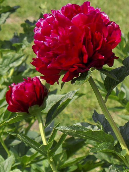 Fleurs de 18 cm de diamètre, à la forme régulière, semi-doubles, rouge sang, légèrement parfumées.