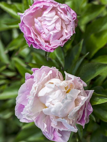 Fleurs de 15 cm de diamètre, doubles. Pétales nacrés, du rose-lilas tendre au blanc. Bien parfumée.