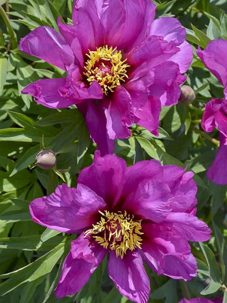 Plus compact que les pivoines arbustives, 60-90 cm haut et de large. Port arrondi. Feuilles semi-rigides,. Larges fleurs et souvent parfumées. Croissance moyenne.