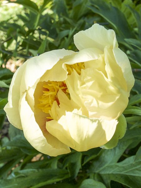 Pivoine hybride semi herbacée, semi-arbustive aux fleurs simples, jaune lumineux à reflets vert, au cœur d'étamines jaune d'or. Parfum léger. Robuste et vigoureuse.