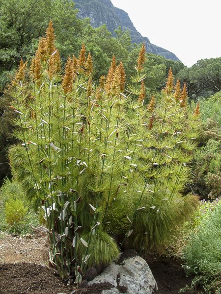 Grande vivace graphique ressemblant à une prêle ou un bambou. Tiges ramifiées et pubescentes, vert vif, sans feuilles. Épis de fleurs brunes. Croissante assez lente. Rustique jusqu'à -10°C en sol très bien drainé.