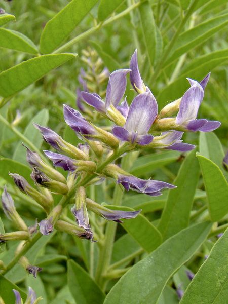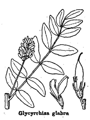 — Plante vivace de 50 cm à 1 mètre, herbacée, glabrescente, dressée, robuste, à souche ligneuse, longuement stolonifère ; feuilles imparipennées, à 4-8 paires de folioles elliptiques ou oblongues, entières, visqueuses en dessous ; stipules très petites, peu apparentes ; fleurs bleuâtres ou violacées, assez petites, nombreuses, en grappes spiciformes cylindriques, sur des pédoncules axillaires égalant la moitié de la feuille ; calice pubescent-glanduleux, tubuleux, bossu à la base, à 2 lèvres, à 5 dents peu inégales, lancéolées, plus longues que le tube ; étendard dressé, oblong, plus long que les ailes dépassant la carène aiguë ; étamines diadelphes; stigmate oblique ; gousses oblongues, bosselées, très comprimées, finement veinées, non stipitées, à 2-4 graines lenticulaires. Fossés et prairies du Midi : Var, Bouches-du-Rhône, Hérault. — Europe méridionale ; Asie occidentale ; Algérie.=Juin-juillet. — Assez souvent cultivé et parfois subspontané. Sa racine sucrée est très usitée comme émolliente et pour édulcorer les tisanes.