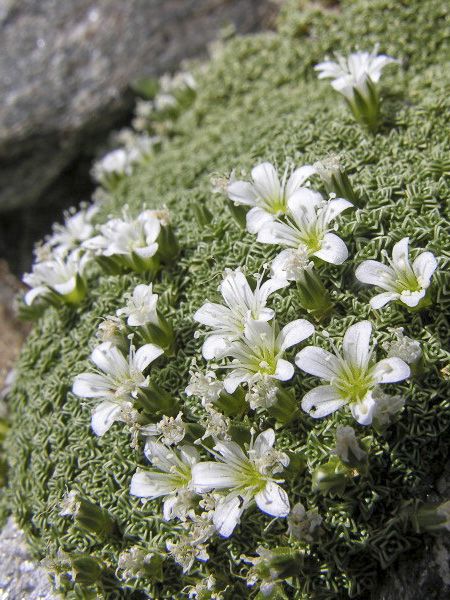 Vivace de rocailles formant un coussin dense et gazonnant. Petites feuilles imbriquées, grisâtres. Au milieu du printemps, elle se couvre e petites fleurs étoilées, blanches à 5 pétales.