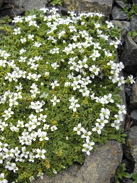 Vivace de rocailles formant un coussin dense. Petites feuilles imbriquées, vertes. Au milieu du printemps, elle se couvre e petites fleurs étoilées, blanches à 5 pétales.