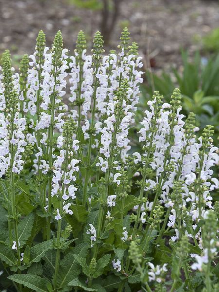 Sauge vivace et rustique de la série ColorSpires aux épis de fleurs blanches. Feuillage aromatique.