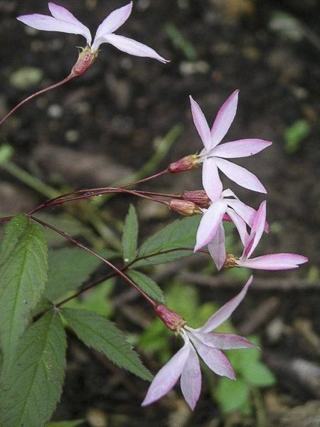 Vivace hermaphrodite, caduque, 0,80-1,20 m, érigée, branchue. Tiges teintées de rouge. Feuilles à 3 folioles de 8 cm, dentées, ovales à lancéolées, vert bronze, profondément veinées. Stipules petites et acérées. Belles couleurs d'automne. Inflorescences en panicules. Fleurs en étoile, à pétales très étroits, blanches, teintées de rose, 2,5-4 cm ; calice teinté de rouge.